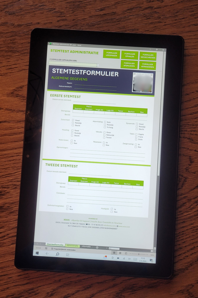 Zoals ik al zei: 'Liever halen we het stemtestformulier uit de laptop'. En dan bedoel ik niet zo'n in elkaar geknutseld Excelletje met rasterlijntjes en zonder fatsoenlijke opmaak, maar ik bedoel dan een echt mooie Excel-sheet, die bijna niet te herkennen is als Excel-sheet. Ik word daar zelf - als onderdeel van de commissie die stemtesten afneemt - heel blij van en met mij ook andere koren die hier inmiddels gebruik van maken.
